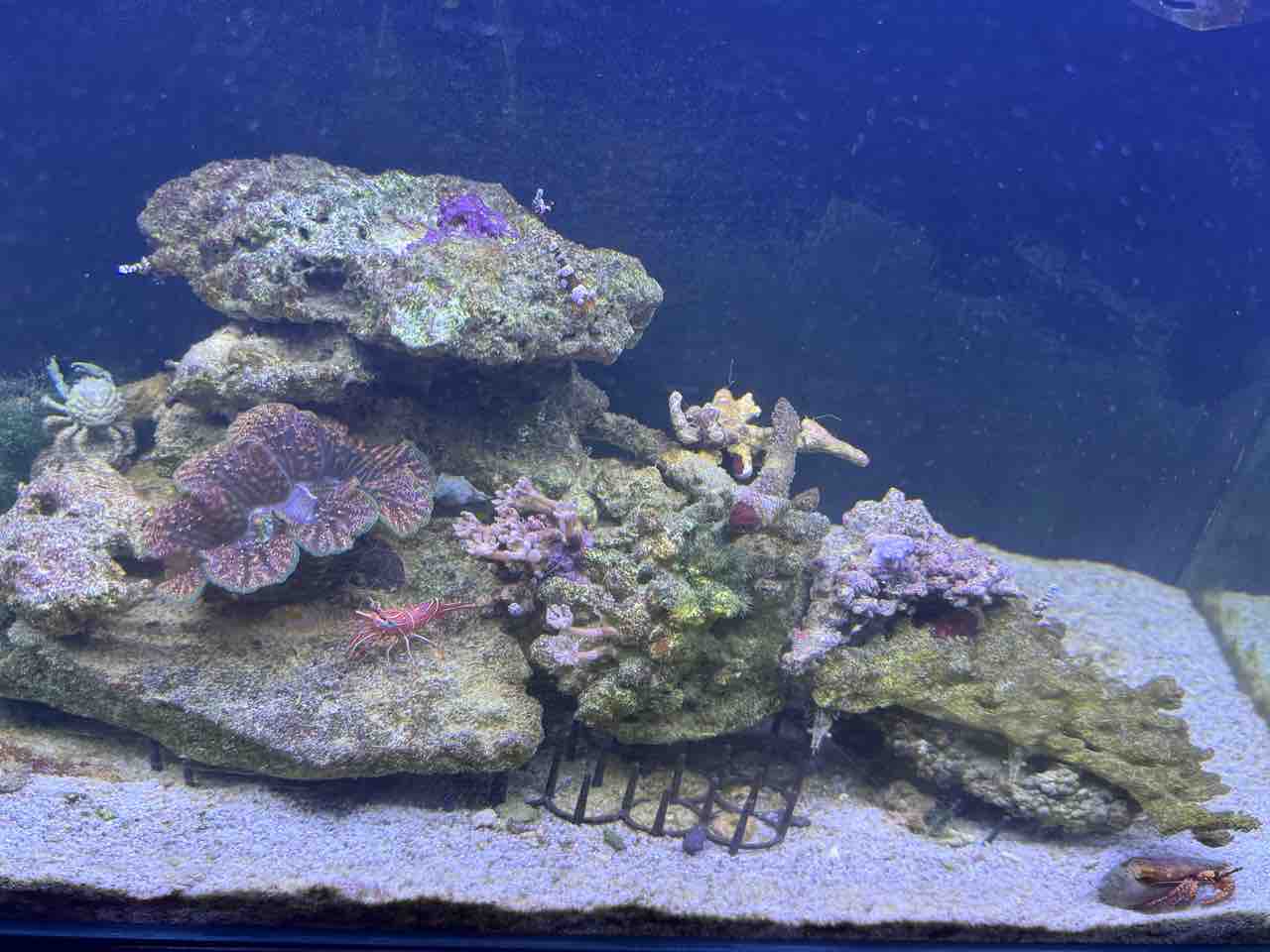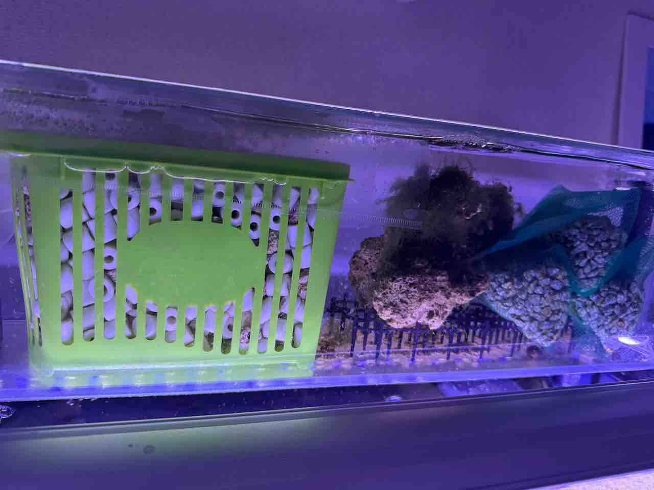 汚す生体がいない他、餌も1日一回プレコ餌をヤドカリに上げる程度ですが、プロテインスキマーなしでNO2、NO3がほぼ出ていないので、しばらくこの濾過層で水質をウォッチしていきます。